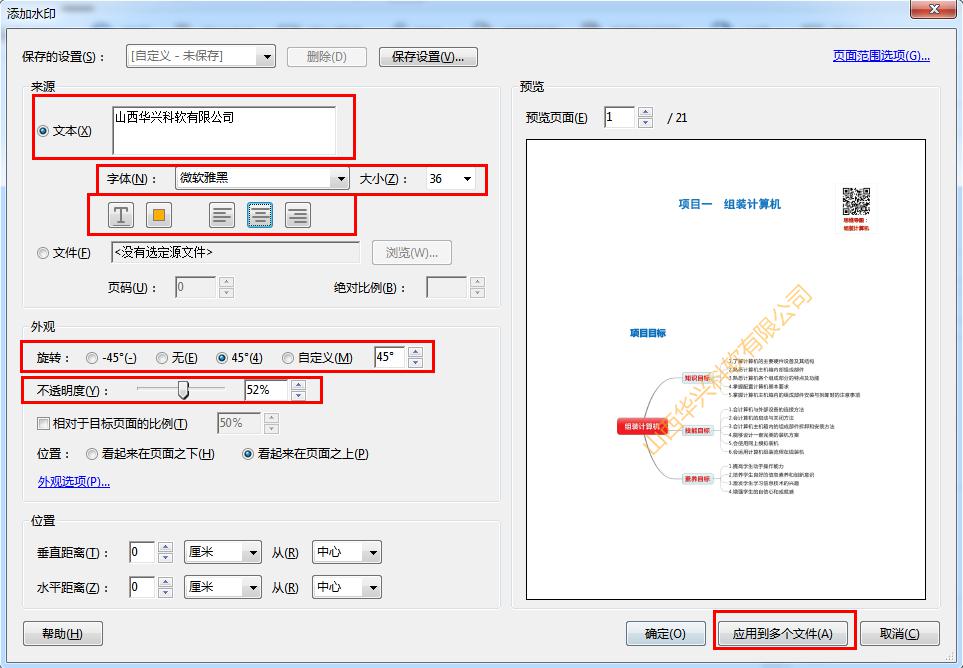 会弹出水印设置对话框。输入水印的内容,比如我要加“山西华兴科软有限公司”水印,输入“山西华兴科软有限公司”,字体、字号、颜色、倾斜度、透明度可根据自己喜欢的样式选择。右面可以看到水印设计预览效果。设置完之后,点击下面的“确定”按钮。即可设置完成。