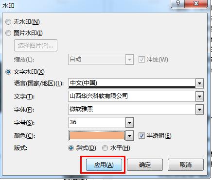 文字水印选择后,输入水印的内容,比如我要加“山西华兴科软有限公司”水印,输入”山西华兴科软有限公司“,字体、字号、颜色、版式可点击三角形下拉菜单,根据自己喜欢的样式选择。设置完之后,点击下面的”确定“按钮。即可设置完成。